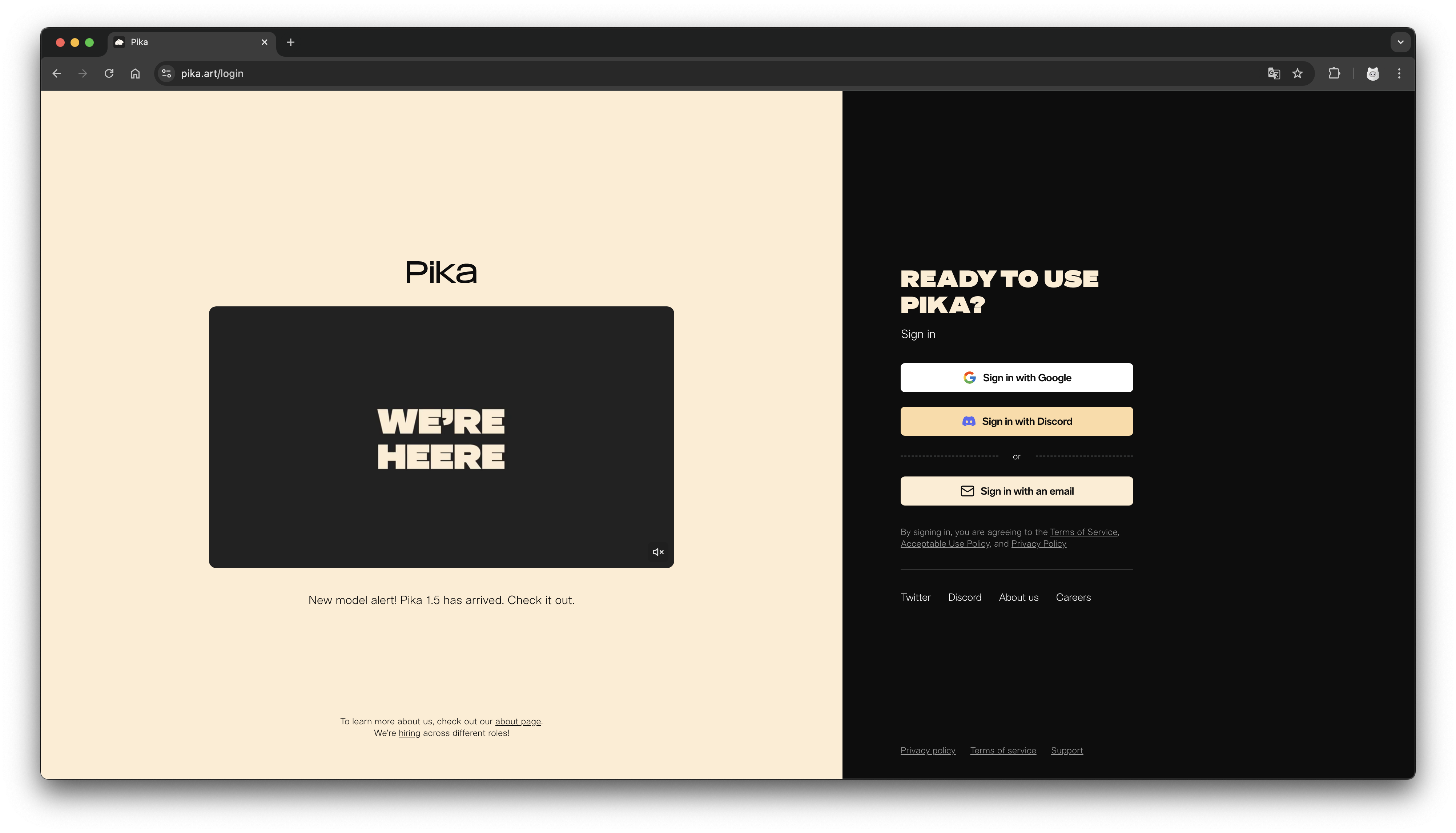 Pika art는 다운로드 없이 웹에서 영상을 만들 수 있는 생성형 ai 도구입니다. 사이트(https://pika.art/)로 이동합니다.